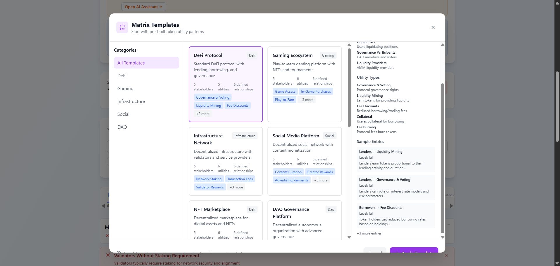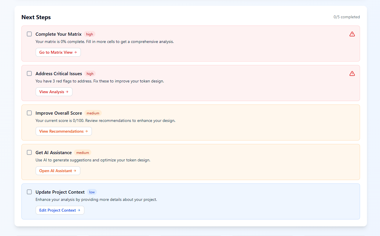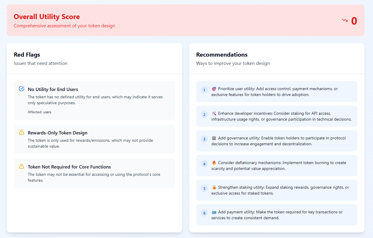 As the matrix fills, the system scores your design and runs coverage checks. It highlights gaps, overloaded utilities, and red flags such as reward-heavy models, weak holding incentives, or undefined treasury roles.