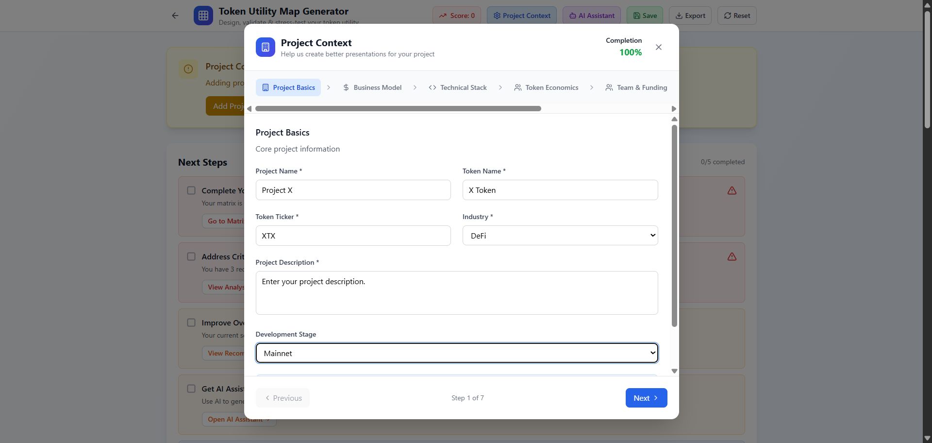 You begin by defining the core details of your project. This includes your product stage, market focus, technical stack, token supply and vesting, and your team’s background.