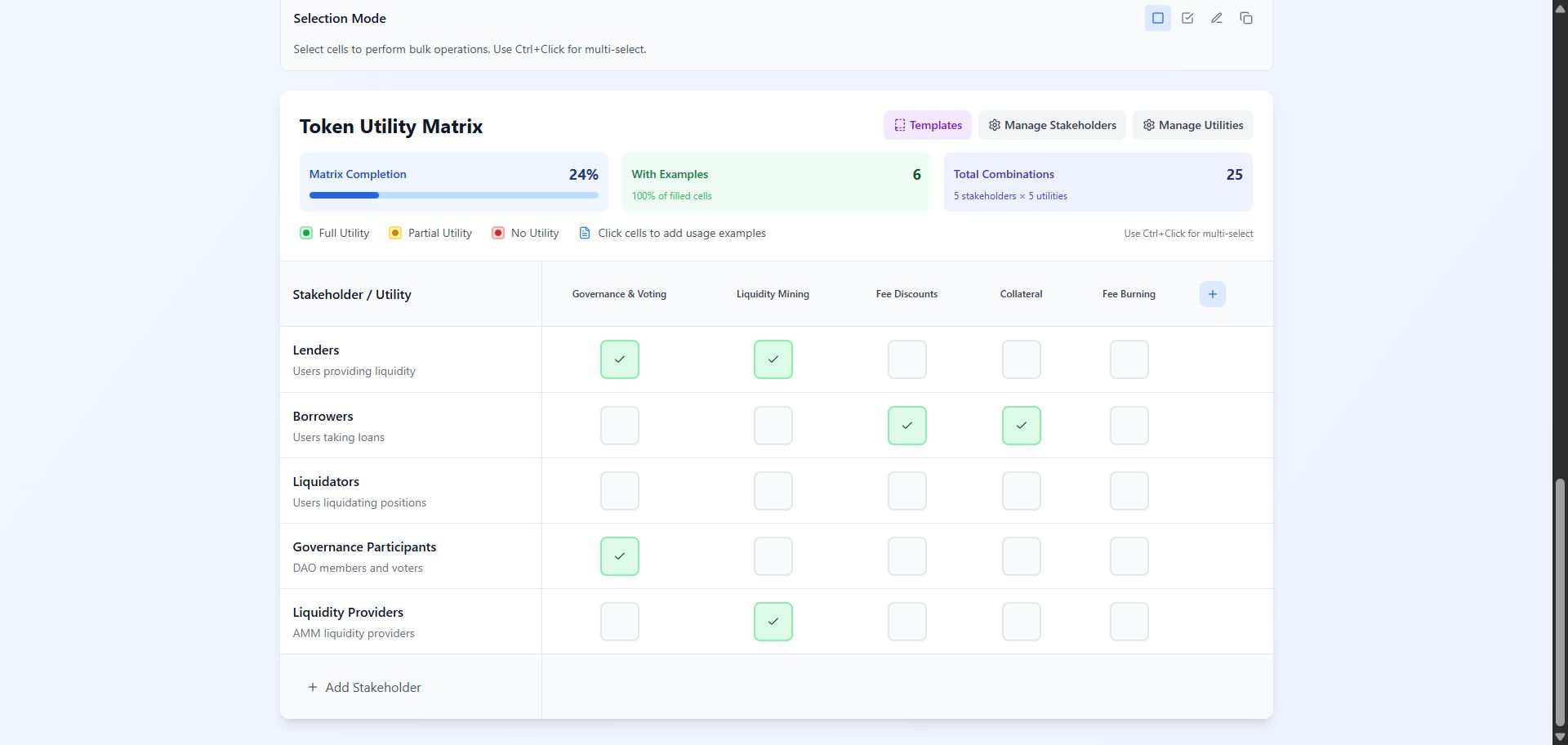 Token Utility Planner helps you map, score, and validate token utility against stakeholder needs, industry standard templates, patterns, and your project context to give you clarity and produce a utility model that is defensible and aligned with your product.